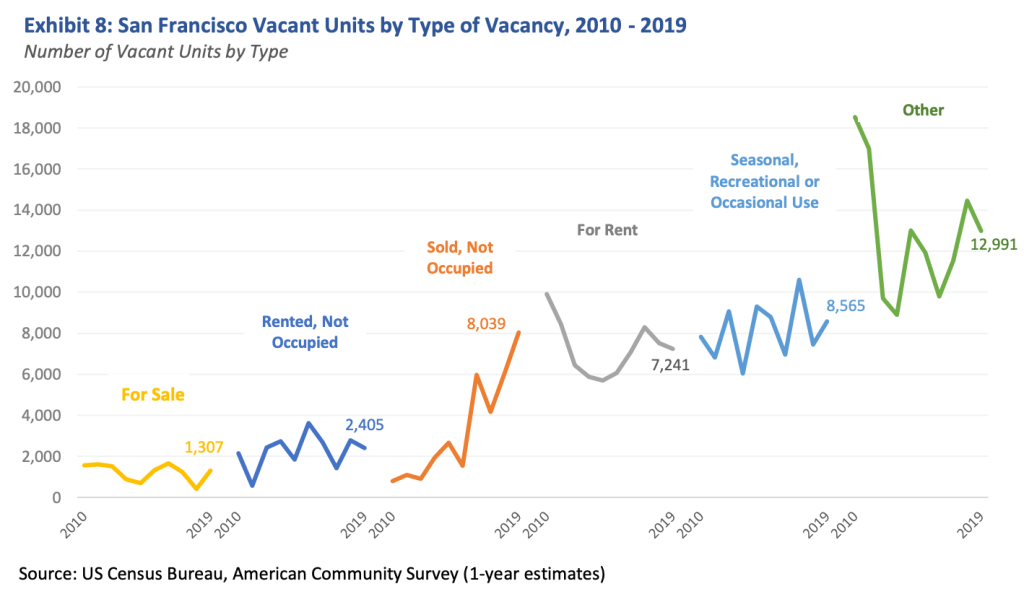 A 2022 report from the Bureau of the Legislative Analyst prepared ahead of Prop M outlines the trends in unoccupied units across major categories, based on the American Communities Survey- most are relatively stable as a portion of the housing stock, with two notable exceptions: “Other” category, and “Sold, Not Occupied”